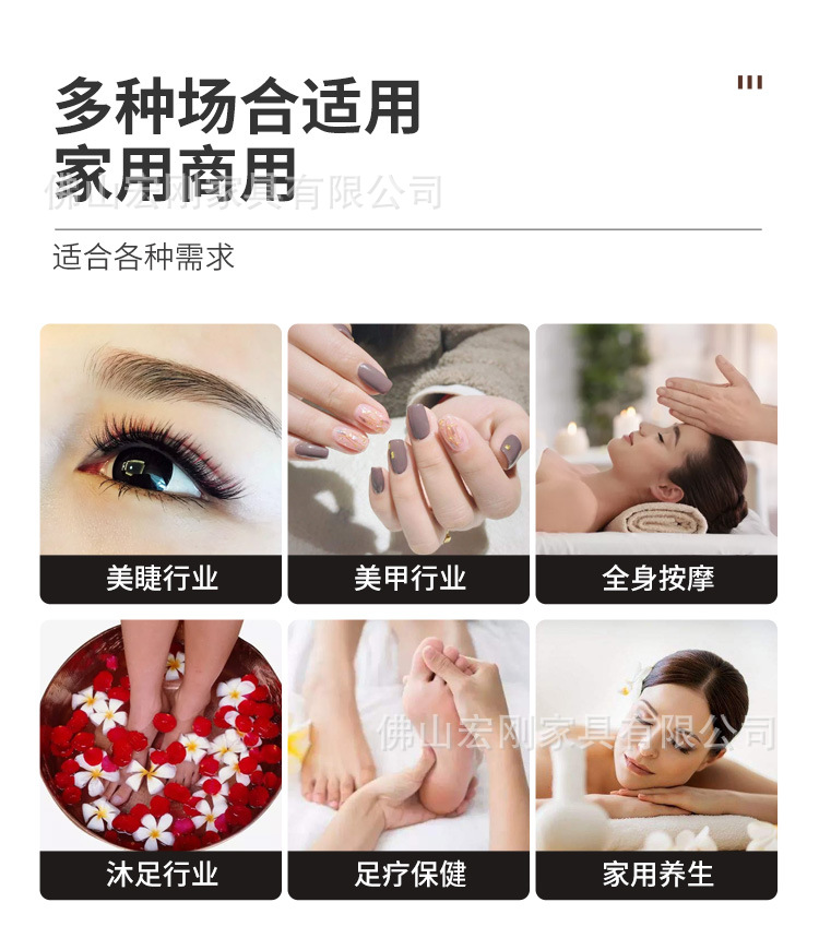 • Tư thế ghế ngả linh hoạt, thích hợp cho làm móng, gội đầu, chăm sóc da, hoặc massage toàn thân.