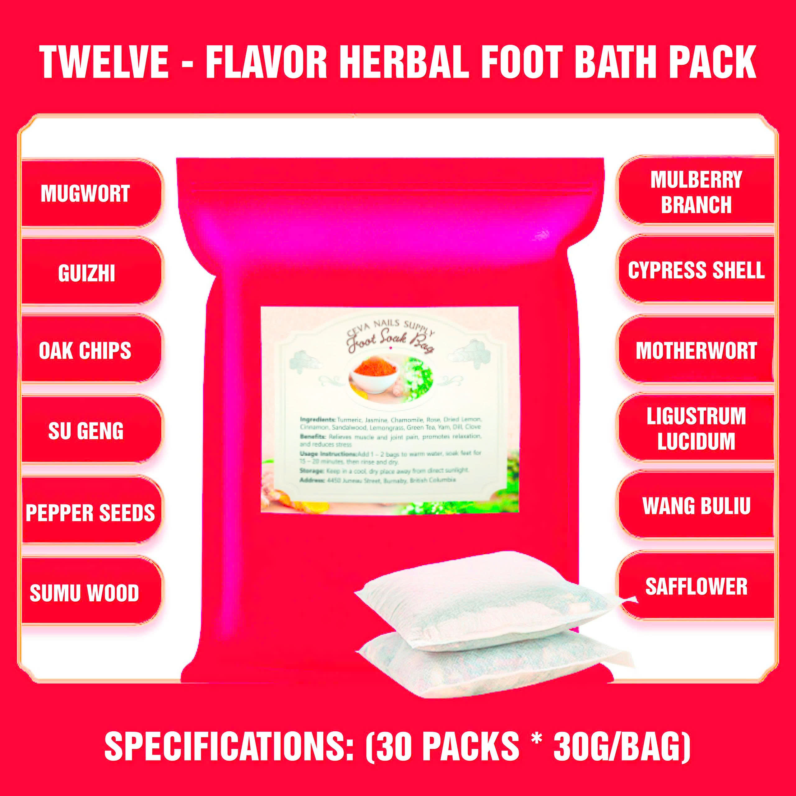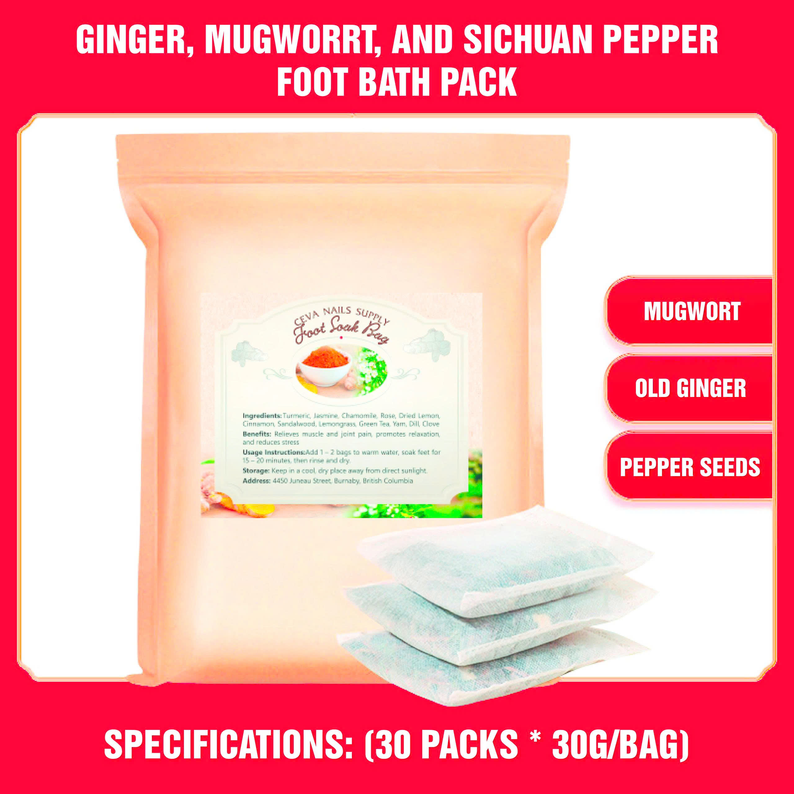 Gói ngâm chân được làm từ các thành phần như ngải cứu, gừng và tiêu Tứ Xuyên; gói ngâm chân có chứa ngải cứu, lạc tiên, gừng và ích mẫu; gói ngâm chân được làm riêng theo nhãn hiệu riêng.