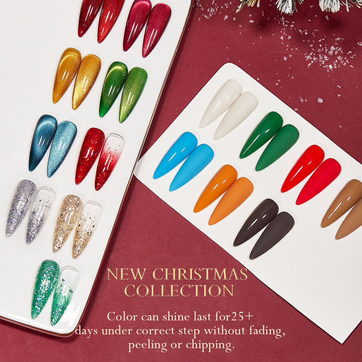 Bao gồm các tông nổi bật mùa lễ hội: đỏ Giáng sinh, nhũ vàng sâm panh, mắt mèo lấp lánh.