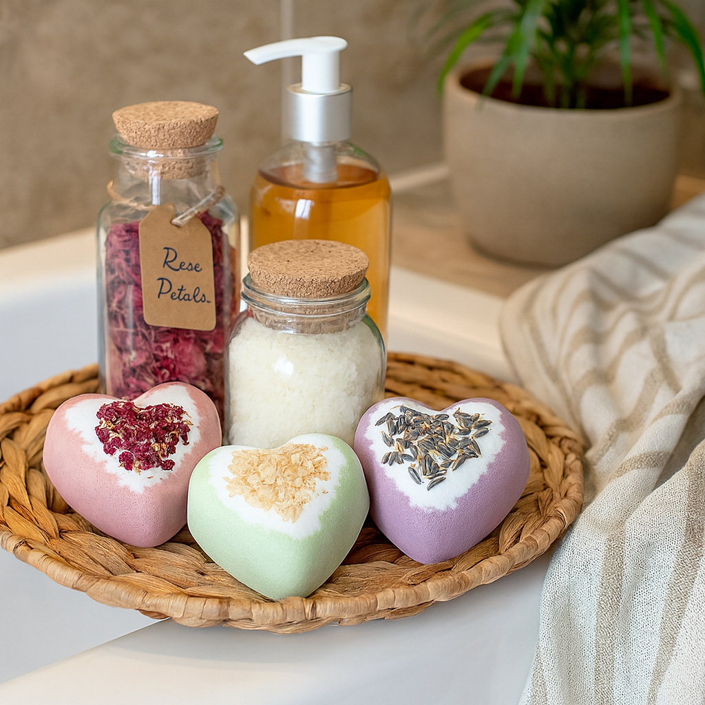 Set bom tắm hình trái tim với tinh dầu hoa hồng và hoa khô